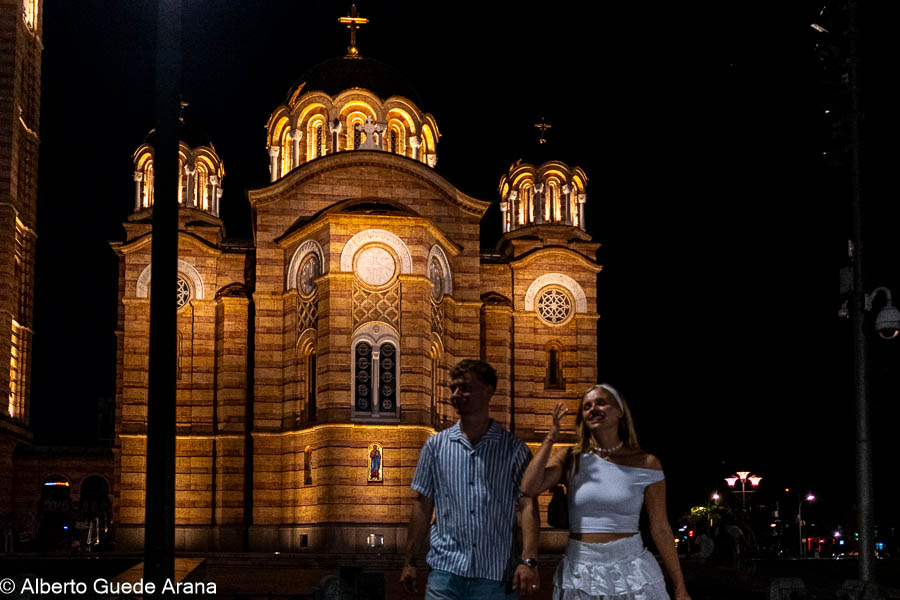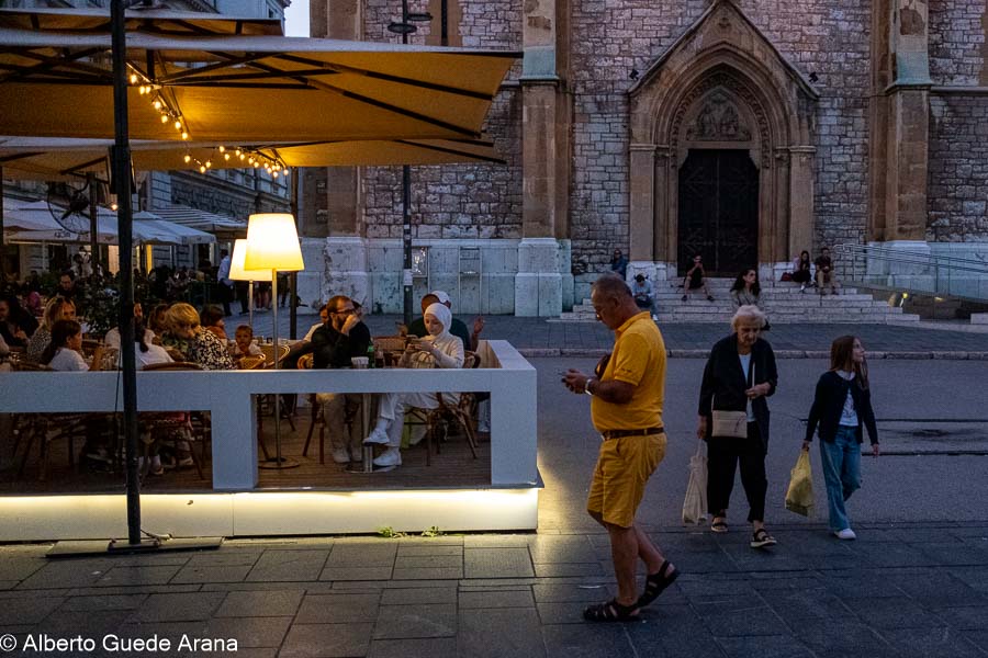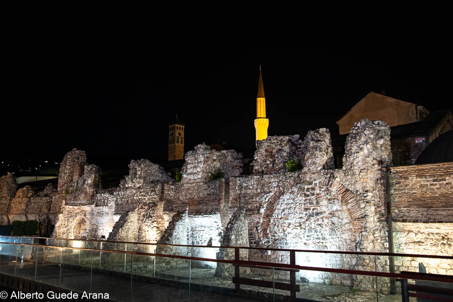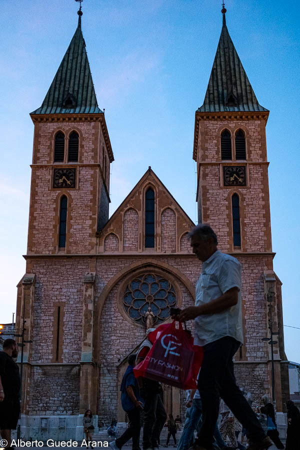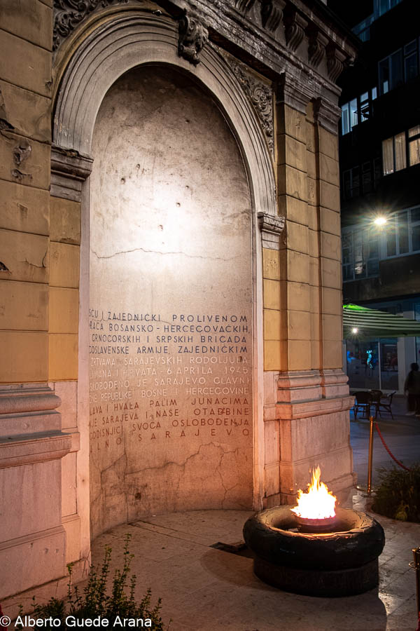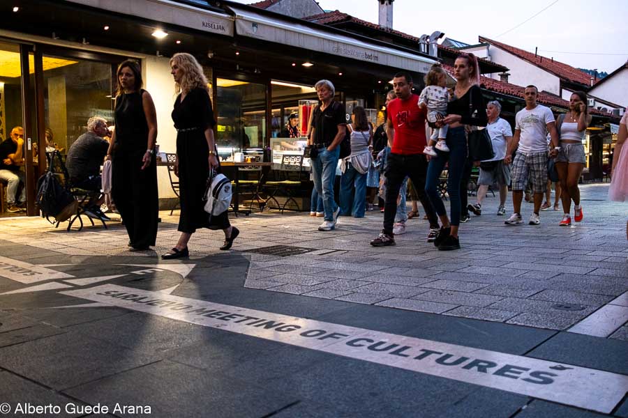Ya cayendo la noche y siguiendo la calle principal llegamos a un punto donde en el suelo está grabado que Sarajevo es una fusión de culturas y donde en 2 metros cambias de ver una ciudad otomana, a ver una ciudad 100% europea.