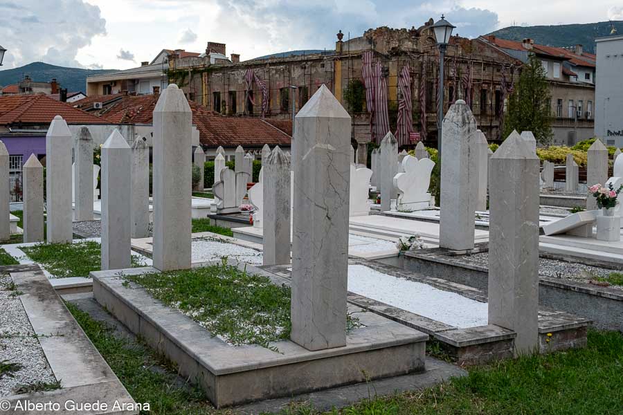 La diferencia en este viaje sobre mi anterior visita es que tuvimos tiempo para alejarnos un poco (no mucho) de él, recorriendo calles cercanas. En ellas aun se pueden ver los restos de la guerra de Bosnia. Restos tanto en edificios aun por reconstruir, como en cementerios que son parte de la ciudad, o incluso parques donde la gente pasea y descansa entre tumbas. También se puede ver restos de lo que era el antiguo suelo de Mostar. Una joya que fruto de la guerra se perdió, y no se ha reconstruido acorde a la historia. Es lógico ya que se priorizó en la reconstrucción el dar servicio a la gente por encima de preservar y recuperar el patrimonio histórico.