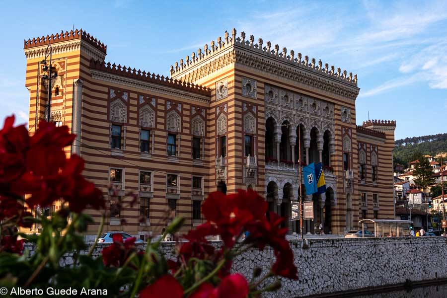 ¡Y por fin llegamos a Sarajevo! Esta primera tarde-noche la aprovechamos para pasear en grupo por la ciudad y recorrer sus entornos más reconocidos. Arrancamos el paseo desde nuestro hotel en dirección al ayuntamiento. Edificio que también fue biblioteca antes de la guerra, y que fue arrasado en la misma, aunque ahora está totalmente reconstruido.