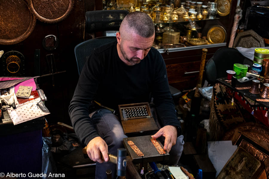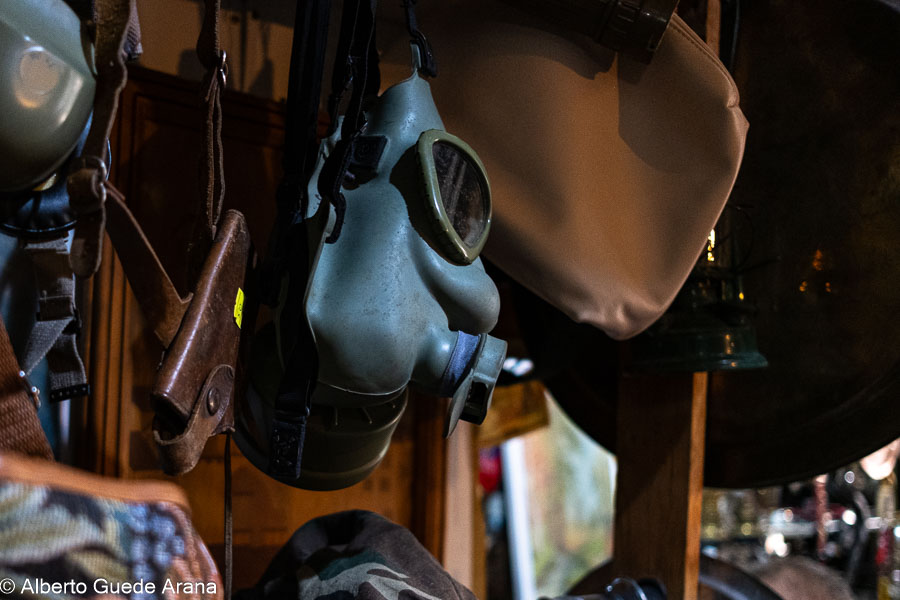Aprovechamos también el rato de la comida que algunos nos saltamos (seguíamos aun con el estómago lleno de empachos previos) para hacer un recorrido por el mercado y en especial visitando a los auténticos artesanos del cobre que aun existen. Yo adquirí un precioso marca páginas que personalicé con mi nombre. Una joya para mi colección. Pero también entramos en alguna tienda de anticuarios cuyas piezas sorprendían: cascos y armas de la guerra, o máscaras de gas eran parte del inventario. ¿Hemos normalizado la barbarie como para tener esto a la venta en una tienda? Parece que sí. Triste.